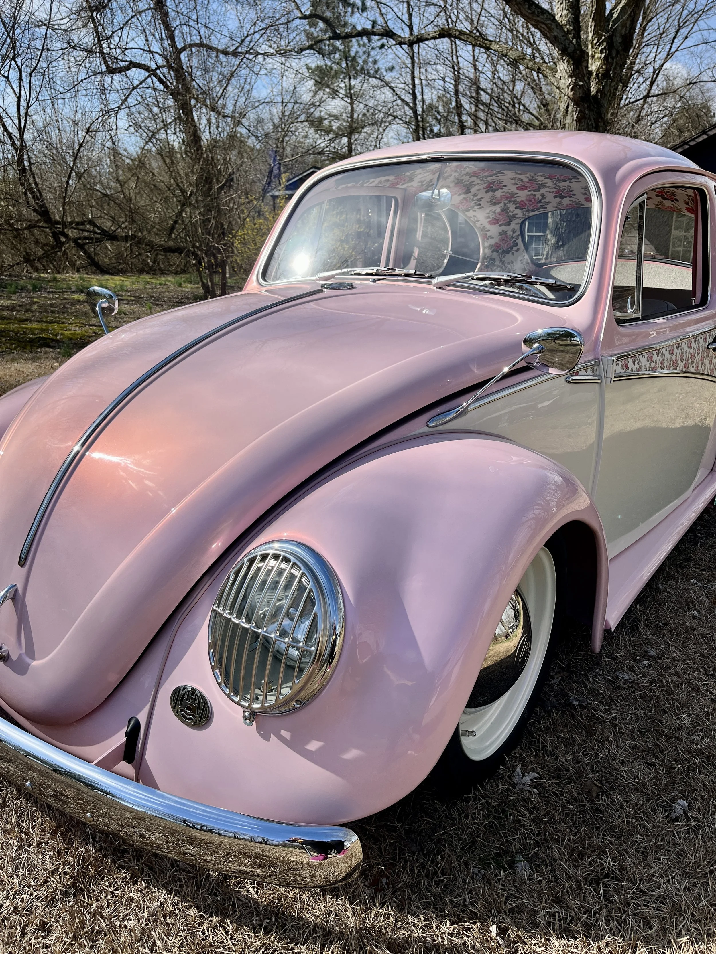 Vintage pink Volkswagen Beetle with floral interior details in an outdoor setting.