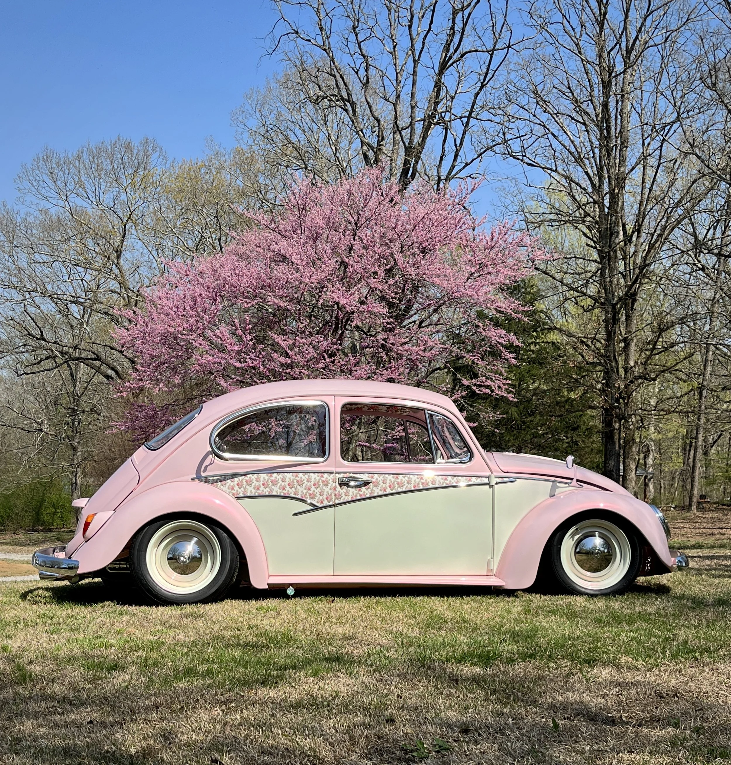 Pink vintage Volkswagen Beetle parked on grass, with decorative floral trim on the side, surrounded by trees.